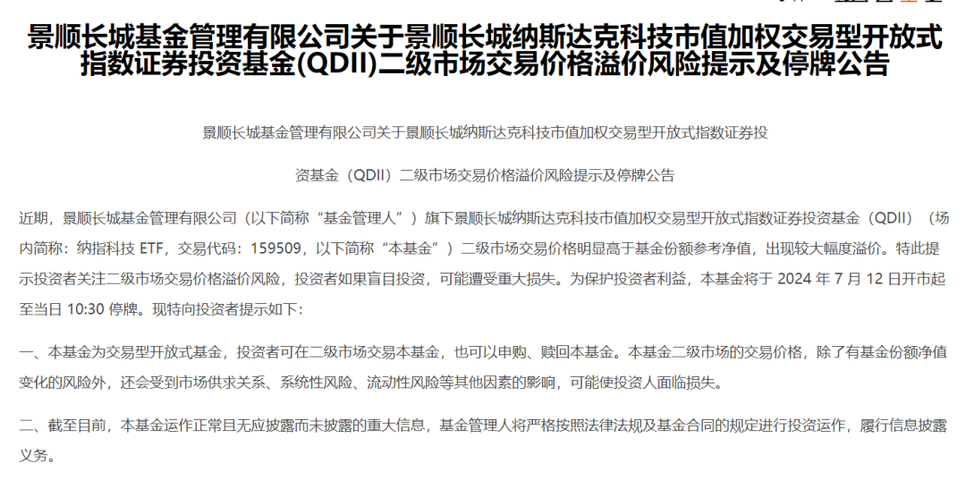 7月11日,景顺长城基金公告称,景顺长城纳指科技ETF二级市场交易价格明显高于基金份额参考净值,出现较大幅度溢价。特此提示投资者关注二级市场交易价格溢价风险,投资者如果盲目投资,可能遭受重大损失。为保护投资者利益,基金将于7月12日开市起至当日10:30停牌。