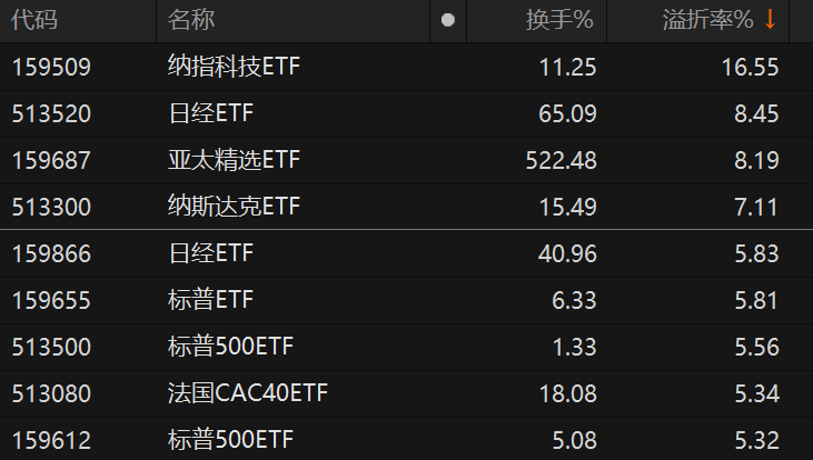 从最新溢价率情况看,Choice数据显示,截至7月11日,景顺长城纳指科技ETF基金溢价率为16.55%,华夏日经ETF、华夏纳斯达克ETF等溢价率均在7%以上。