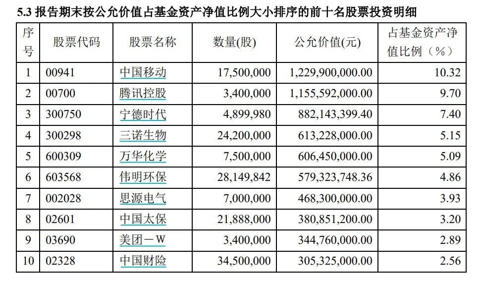 持仓方面,该基金二季度增持了宁德时代、三诺生物、万华化学、伟明环保、中国财险,减持了中国移动、思源电气、美团-W,持有腾讯控股的数量不变,新进的中国太保为前十大重仓股。