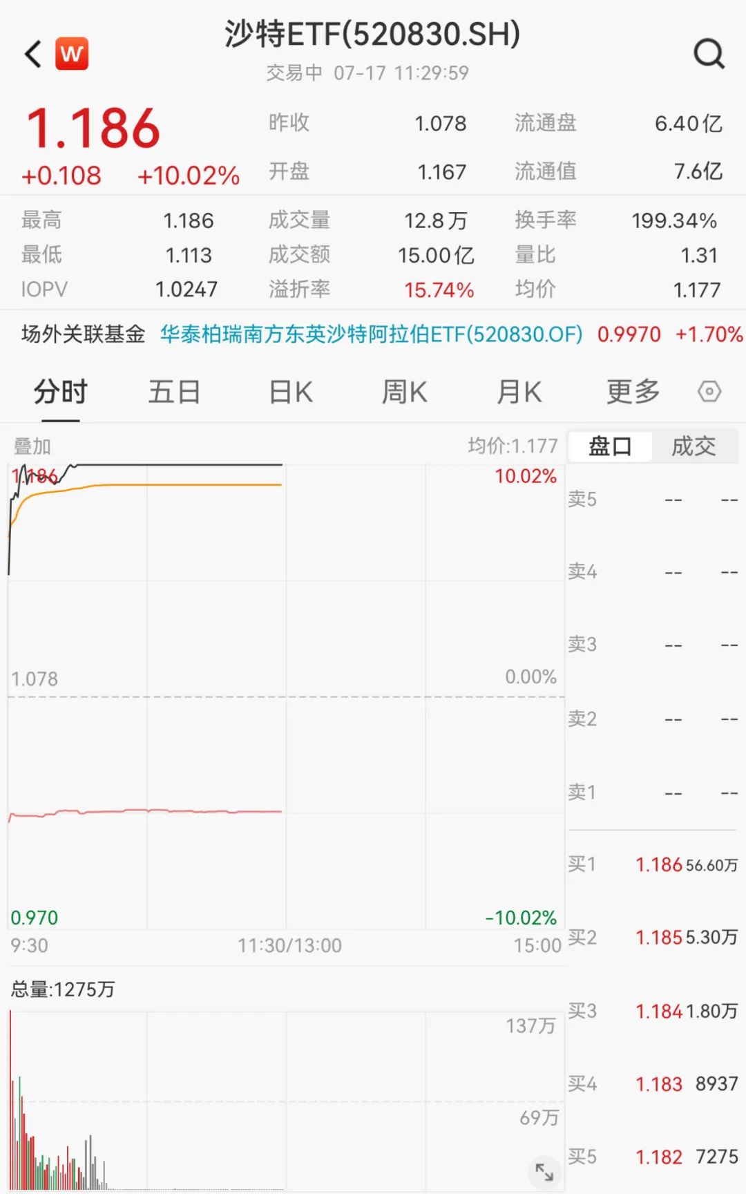 7月17日,华泰柏瑞基金、南方基金旗下的首批沙特ETF延续上市首日的涨停态势,开盘不久后再度涨停。
