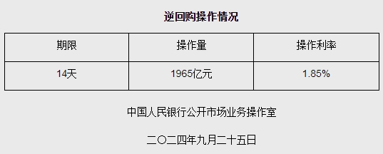 为维护季末银行体系流动性合理充裕,2024年9月25日人民银行以固定利率、数量招标方式开展了1965亿元逆回购操作。具体情况如下: