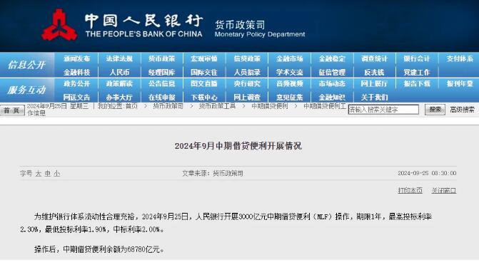 维护银行体系流动性合理充裕,9月25日,中国人民银行开展3000亿元中期借贷便利(MLF)操作,期限1年,最高投标利率2.30%,最低投标利率1.90%,中标利率2.00%。操作后,中期借贷便利余额为68780亿元。