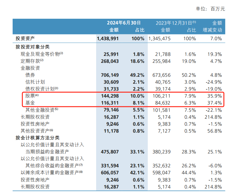 半年报显示,截至今年6月30日,新华保险股票投资金额约1443亿元,在投资资产中占比10.0%;与去年末相比,股票投资金额增加近400亿元,增幅35.9%,股票在总盘子中的占比提升2.1个百分点。