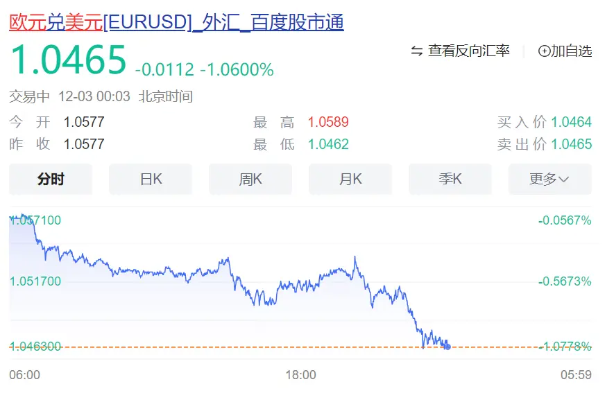 12月2日晚间,欧元汇率突然跳水,欧元兑美元跌超1%。