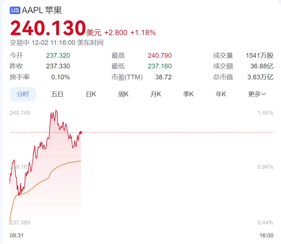 美股“科技七巨头”悉数走强,苹果公司股价盘中创下历史新高,市值高达3.63万亿美元。
