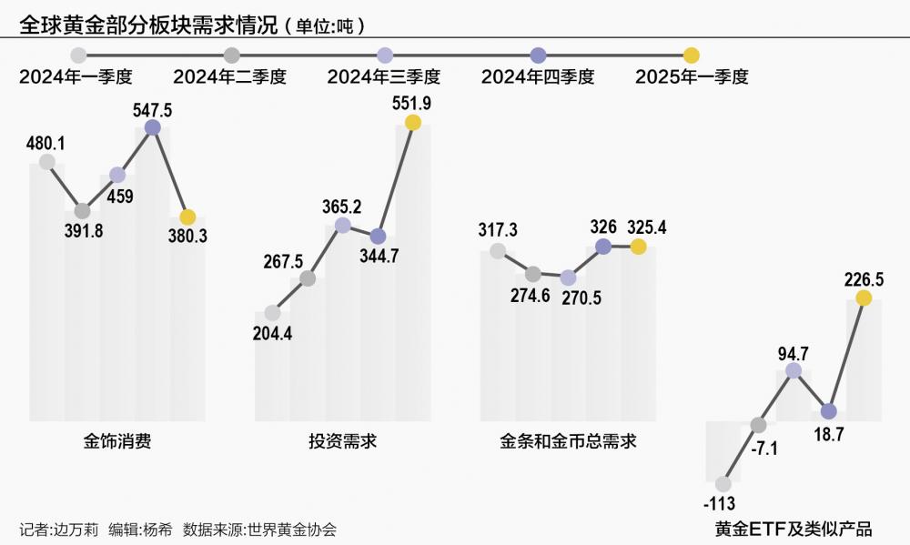 金价一路狂飙,不少消费者对黄金投资心动不已。与金饰行业逻辑不同,金价飙升成为推动金条和金币需求上涨的关键因素。由于股票和债券等资产表现不佳,投资者纷纷涌向黄金以寻求回报。报告显示,2025年一季度,全球黄金投资总需求量为552吨,同比暴增170%;全球金条金币总需求为325吨,同比增长3%,比五年季度平均水平高出15%。