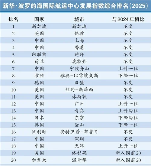 我国约95%的进出口贸易货物量通过海运完成,昼夜不息的港口,是名副其实的外贸“晴雨表”。近日,《新华·波罗的海国际航运中心发展指数报告(2025)》(以下简称《报告》)公布, 共有7个中国港口城市进入全球20强。其中,青岛进位最为明显,由去年的第15位跃升至第13位,首次超越日本东京、韩国釜山等东北亚大港,继续领跑中国北方港口群。