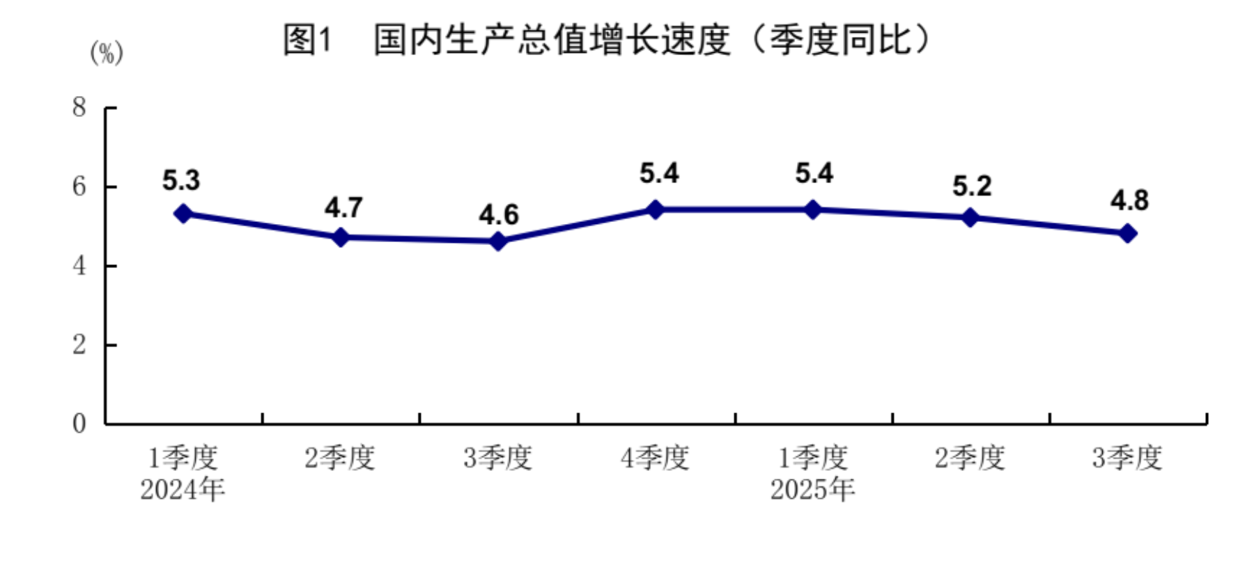 初步核算,前三季度国内生产总值1015036亿元,按不变价格计算,同比增长5.2%。分产业看,第一产业增加值58061亿元,同比增长3.8%;第二产业增加值364020亿元,增长4.9%;第三产业增加值592955亿元,增长5.4%。分季度看,一季度国内生产总值同比增长5.4%,二季度增长5.2%,三季度增长4.8%。从环比看,三季度国内生产总值增长1.1%。