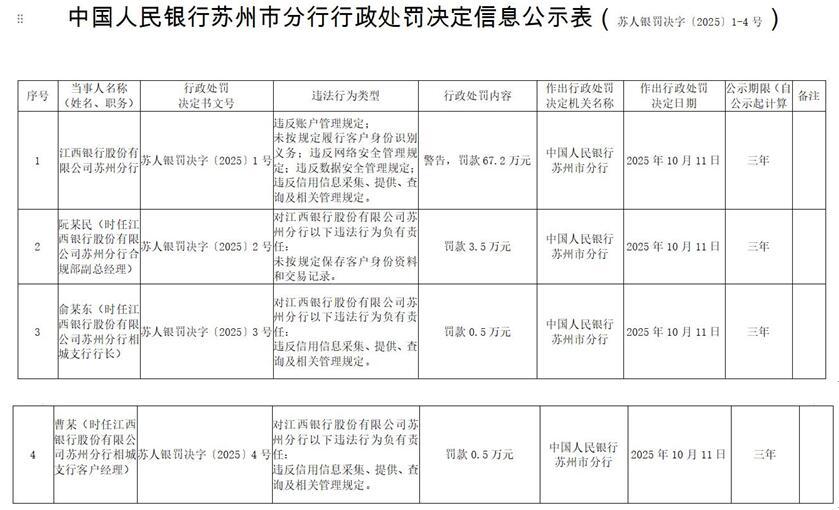 中国人民银行苏州市分行近日公布的行政处罚决定信息公示表(苏人银罚决字〔2025〕1-4号)显示,江西银行股份有限公司苏州分行存在以下违法行为类型:违反账户管理规定;未按规定履行客户身份识别义务;违反网络安全管理规定;违反数据安全管理规定;违反信用信息采集、提供、查询及相关管理规定。中国人民银行苏州市分行对其警告,罚款67.2万元。
