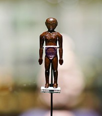 玻璃罩内,一尊高不过掌的裸身木头小人静静站立。它通体髹黑漆,身上刻有纵横交错的经络线,并刻以圆点标示穴位。