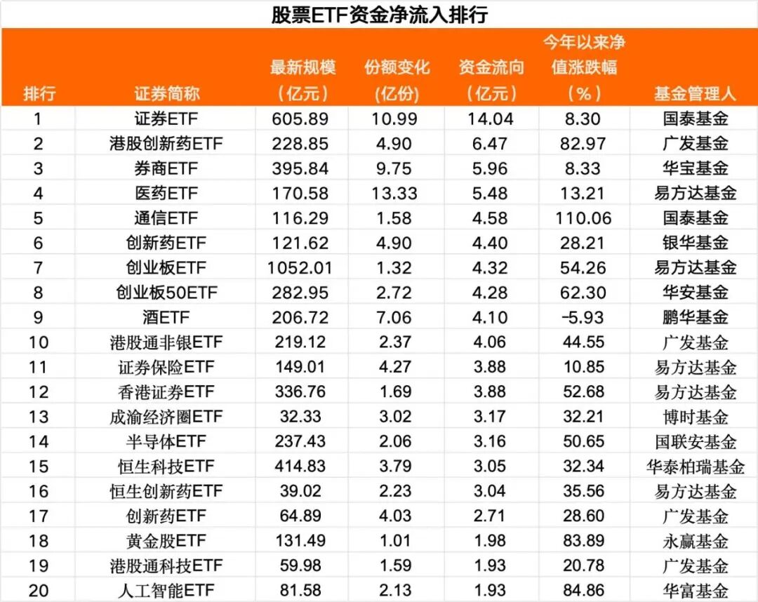 从资金净买入排行榜看,当日净流入1亿元以上的股票ETF有38只,行业主题ETF净流入居前。其中,国泰证券ETF、广发港股创新药ETF、华宝券商ETF位居前三,资金净流入均超5亿元。