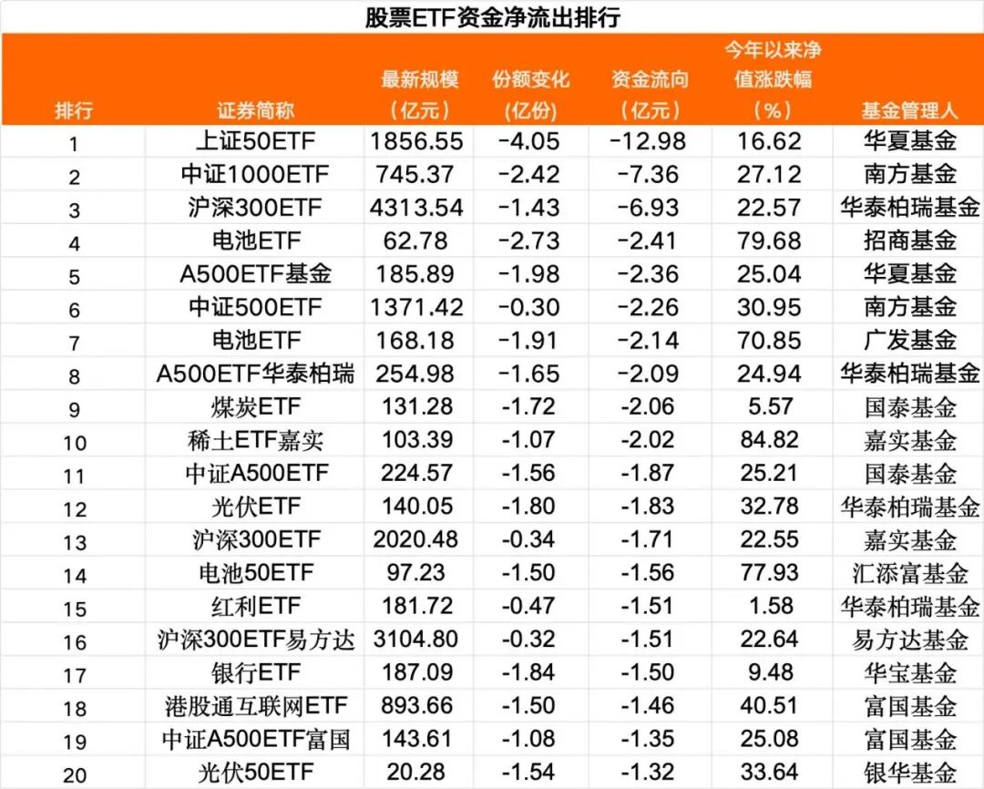 在净流出前20大股票ETF中,宽基方面,单只上证50ETF、中证1000ETF分别净流出资金12.98亿元、7.36亿元;3只沪深300ETF共计净流出超10亿元;4只中证A500ETF合计净流出超7.5亿元。行业主题方面,3只电池ETF合计净流出超6亿元,2只光伏ETF净流出资金也超过了3亿元。