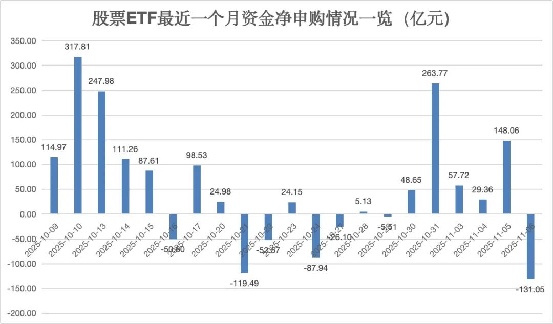 据银河证券基金研究中心数据统计,11月6日,全市场股票ETF(包含跨境ETF)整体资金净流出超131亿元。