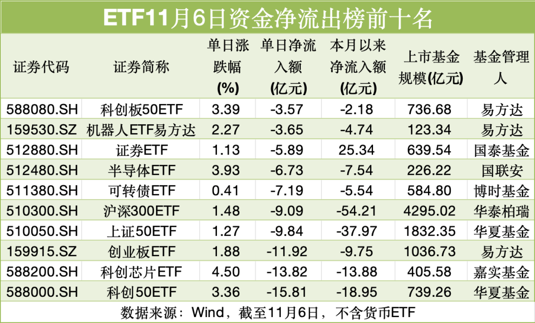 多只跟踪科创50指数、创业板指数、科创芯片指数、上证50指数、沪深300指数的ETF位居资金净流出榜前列。