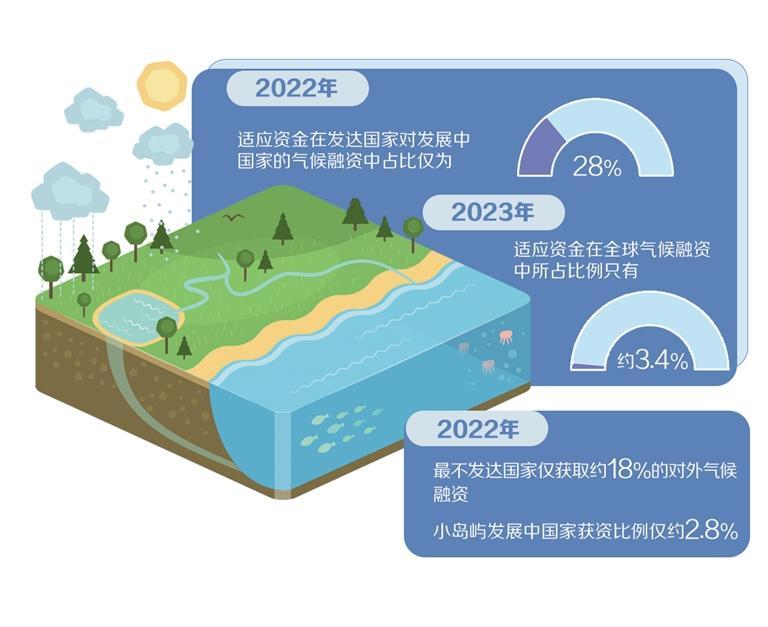 报告指出,尽管2022年实现了融资总规模达“1000亿美元”的承诺目标,但这并不等于满足发展中国家的气候融资需求,融资总量与2024年《联合国气候变化框架公约》第二十九次缔约方大会(COP29)通过的气候融资新集体量化目标中所确定的1.3万亿美元标准差距巨大,并且融资性质以债务为主,未能满足脆弱国家的适应与损失赔偿需求。适应资金作为气候融资的重要构成内容,2022年在发达国家对发展中国家的气候融资中占比仅为28%,而2023年适应资金在全球气候融资中所占比例只有约3.4%,显示出适应资金不仅总体规模较小,而且难以吸引私人资本。