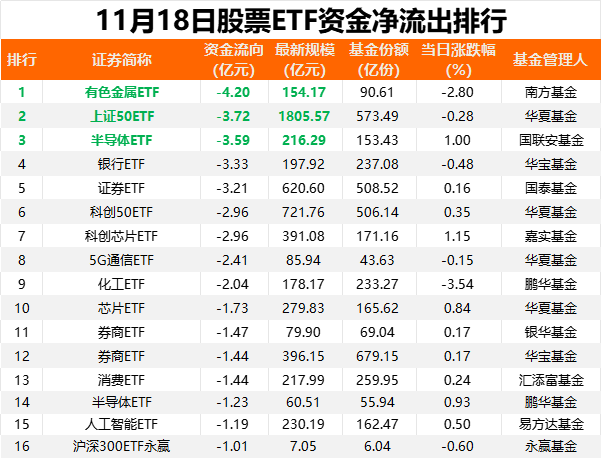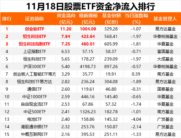 昨日(11月18日),A股三大指数集体收跌。市场调整中,股票ETF获得资金加仓,全市场股票ETF(含跨境ETF)资金净流入超55亿元,港股ETF净流入居前。
