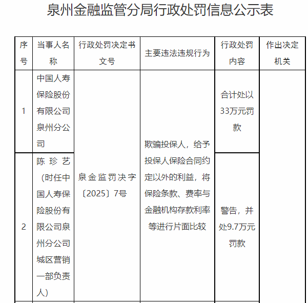 国家金融监督管理总局网站昨日披露的泉州金融监管分局行政处罚信息公示表(泉金监罚决字〔2025〕7号)显示中国人寿保险股份有限公司泉州分公司欺骗投保人,给予投保人保险合同约定以外的利益,将保险条款、费率与金融机构存款利率等进行片面比较,被泉州金融监管分局合计处以33万元罚款。陈珍艺(时任中国人寿保险股份有限公司泉州分公司城区营销一部负责人)被警告,并处9.7万元罚款。