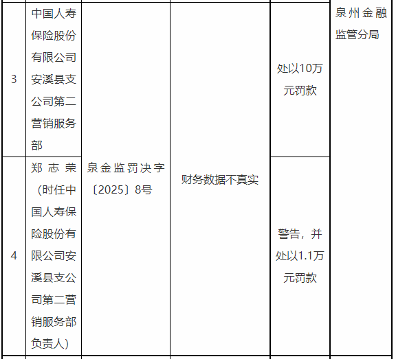 泉金监罚决字〔2025〕10号显示,中国人寿保险股份有限公司永春县支公司财务数据不真实,被泉州金融监管分局处以11万元罚款。郑世荣(时任中国人寿保险股份有限公司永春县支公司经理)被警告,并处以1.3万元罚款。