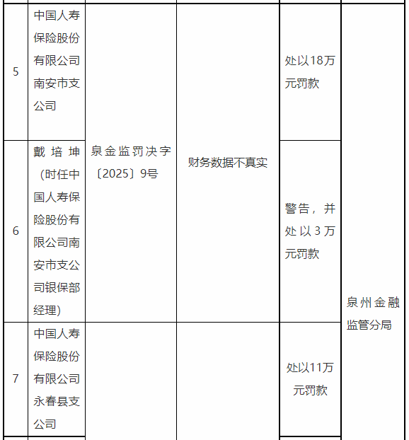 泉金监罚决字〔2025〕9号显示,中国人寿保险股份有限公司南安市支公司财务数据不真实,被泉州金融监管分局处以18万元罚款。戴培坤(时任中国人寿保险股份有限公司南安市支公司银保部经理)被警告,并处以3万元罚款。