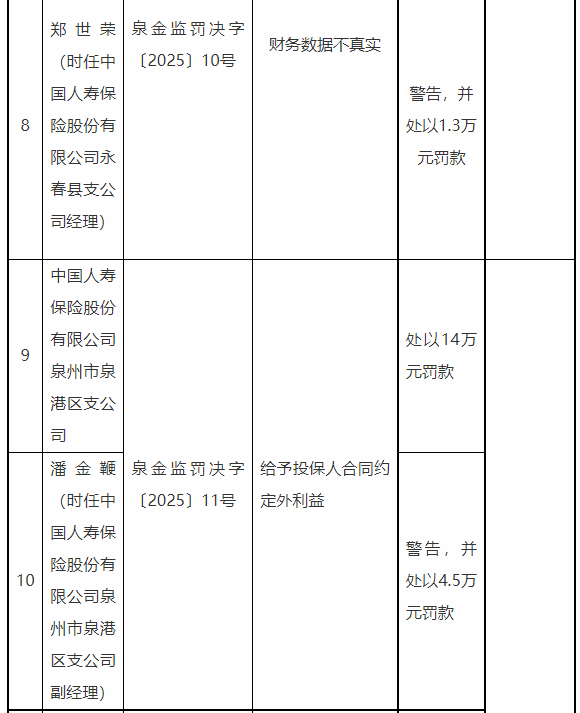 泉金监罚决字〔2025〕11号显示,中国人寿保险股份有限公司泉州市泉港区支公司给予投保人合同约定外利益,被泉州金融监管分局处以14万元罚款。潘金鞭(时任中国人寿保险股份有限公司泉州市泉港区支公司副经理)被警告,并处以4.5万元罚款。