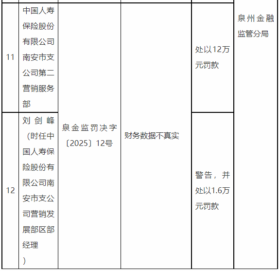 泉金监罚决字〔2025〕12号显示,中国人寿保险股份有限公司南安市支公司第二营销服务部财务数据不真实,被泉州金融监管分局处以12万元罚款。刘剑峰(时任中国人寿保险股份有限公司南安市支公司营销发展部区部经理)被警告,并处以1.6万元罚款。