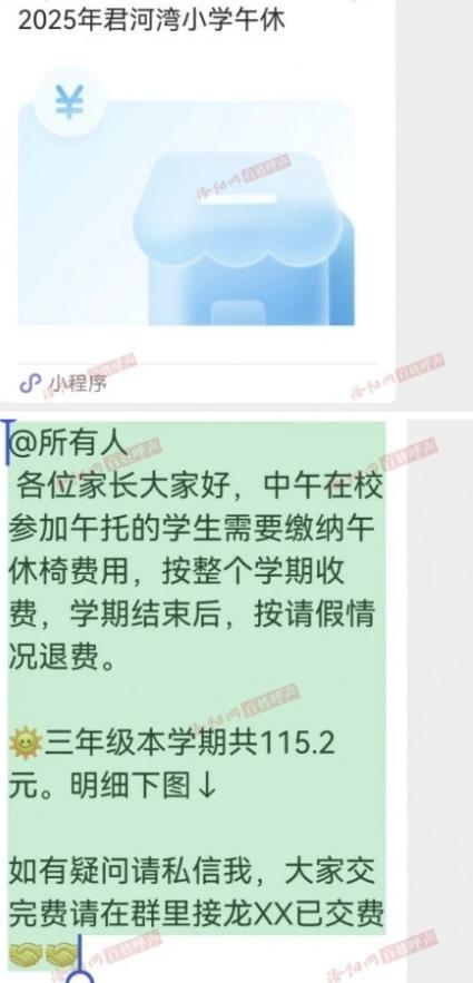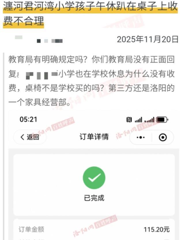 近日,网友反映,洛阳一小学孩子使用学校午休椅要收费,认为收费不合理。相关截图显示,支付费用115元。此前也有网友反映,该校收取午休桌椅费,一学期115元。