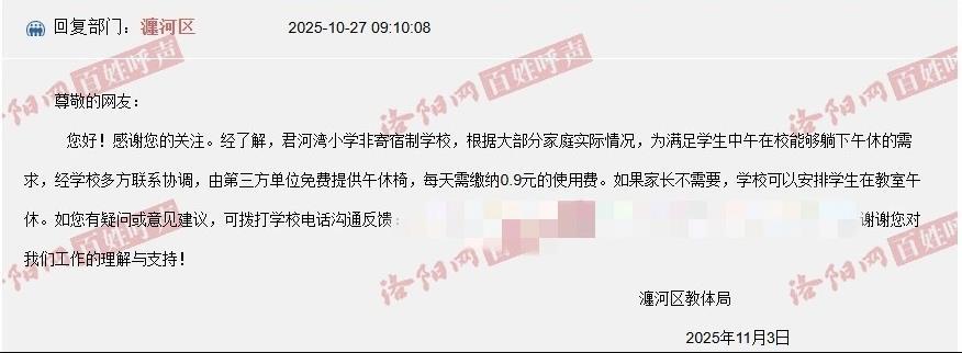 该回复称,学生自由选择是否使用躺椅,目前学校正在统计使用情况,完成统计后将第一时间退费。值得注意的是,瀍河区教体局此前也回复过此事:午休椅由第三方单位免费提供,每天需缴纳0.9元使用费。