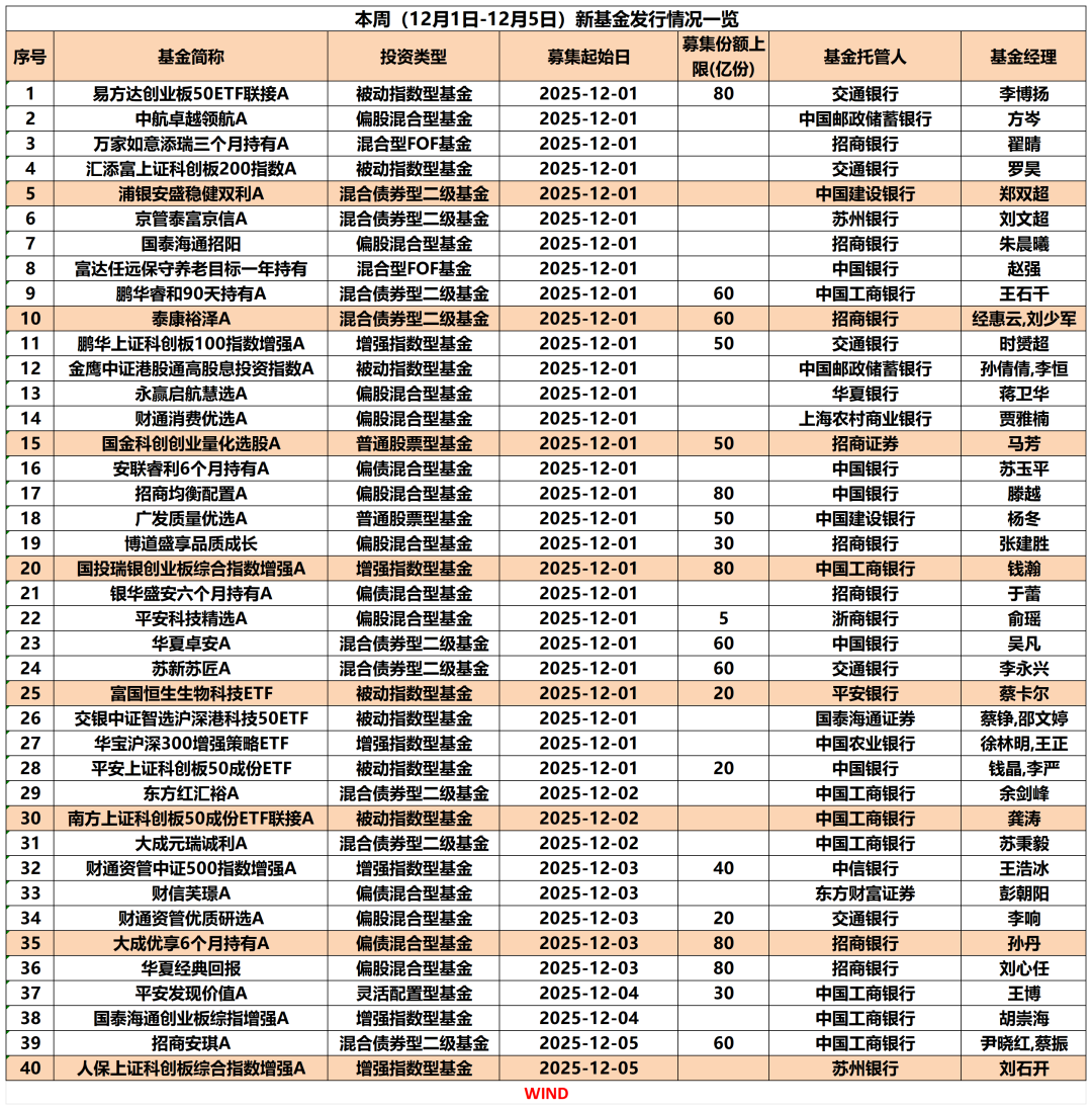 本周(12月1日至12月5日),全市场共有40只新基金(仅统计主代码)面市,12月首日,就有28只新基金“同台竞技”。其中,主动权益型基金和指数型基金成为发行主力。