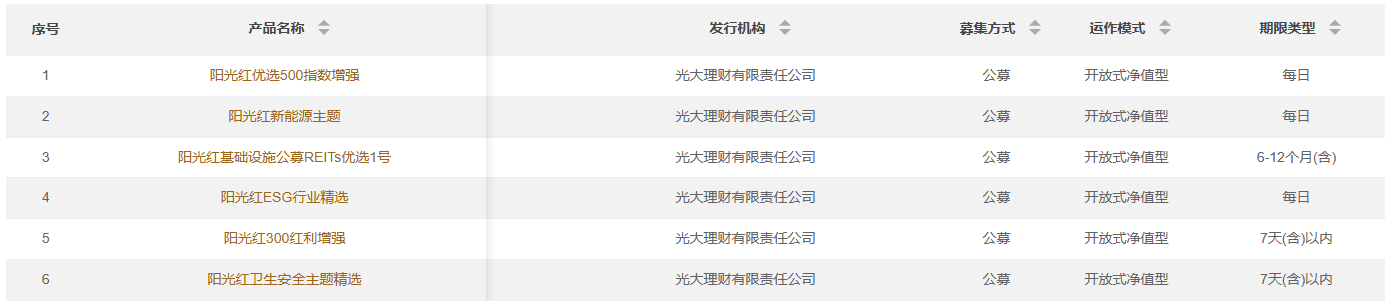 中国理财网数据显示,光大理财有限责任公司目前旗下共有6只权益类理财产品,分别为阳光红优选500指数增强、阳光红新能源主题、阳光红基础设施公募REITs优选1号、阳光红ESG行业精选、阳光红300红利增强、阳光红卫生安全主题精选。
