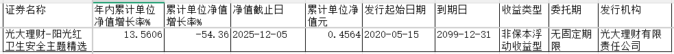 同花顺数据显示,阳光红卫生安全主题精选截至2025年12月5日,累计单位净值为0.4564元,累计单位净值增长率为-54.36%,其发行起始日期为2020年5月15日,为无固定期限非保本浮动收益型理财产品。