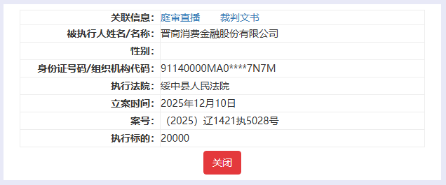 中国执行信息公开网显示,晋商消费金融股份有限公司成为被执行人,执行法院为绥中县人民法院,立案时间为2025年12月10日,执行标的为20000元。