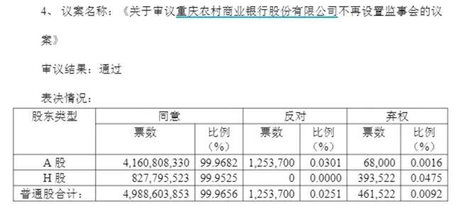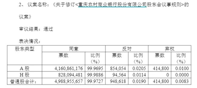 具体来看:《关于修订<重庆农村商业银行股份有限公司股东会议事规则>的议案》以及《关于审议重庆农村商业银行股份有限公司不再设置监事会的议案》的H股股东反对票数分别为94564票、0票,反对比例分别仅0.0114%、0%。