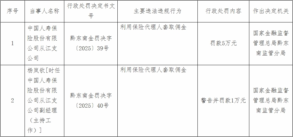 国家金融监督管理总局网站近日公布的黔东南监管分局行政处罚信息公开表(黔东南金罚决字〔2025〕39-40号)显示,中国人寿保险股份有限公司从江支公司利用保险代理人套取佣金,时任中国人寿保险股份有限公司从江支公司副经理(主持工作)杨岚钦对该违法违规行为负有责任。