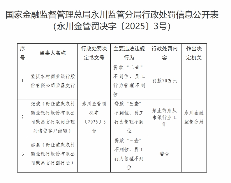 近日,重庆农村商业银行股份有限公司荣昌支行因贷款“三查”不到位及员工行为管理不力,被永川金融监管分局处以70万元罚款。