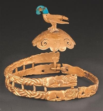 “此冠饰1972年出土于鄂尔多斯市杭锦旗,同批出土了200多件金银器,都有虎、狼、马、羊、鸟等浅浮雕动物形象以及虎咬羊、狼咬羊等咬斗场景,具有鲜明的草原文化特色。”2号展厅策展人沈莎莎介绍,“此冠饰是迄今国内发现的唯一匈奴贵族金冠饰,融铸造、锻压、锤打、抽丝等技术于一身,代表了当时金银器制作工艺的最高水平,在中国艺术史、科技史上具有重要地位。”
