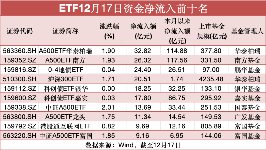 多只宽基ETF位居当日资金净流入榜前十名。其中,A500ETF华泰柏瑞资金净流入超过32亿元,A500ETF南方、华泰柏瑞沪深300ETF资金净流入均超过20亿元。全市场32只中证A500ETF合计资金净流入超过110亿元。
