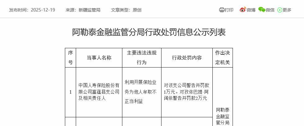 国家金融监督管理总局网站近日发布的阿勒泰金融监管分局行政处罚信息公示列表显示,中国人寿保险股份有限公司富蕴县支公司及相关责任人利用开展保险业务为他人牟取不正当利益。阿勒泰金融监管分局对该支公司警告并罚款1万元。对孜依巴提·阿阔依警告并罚款2万元。