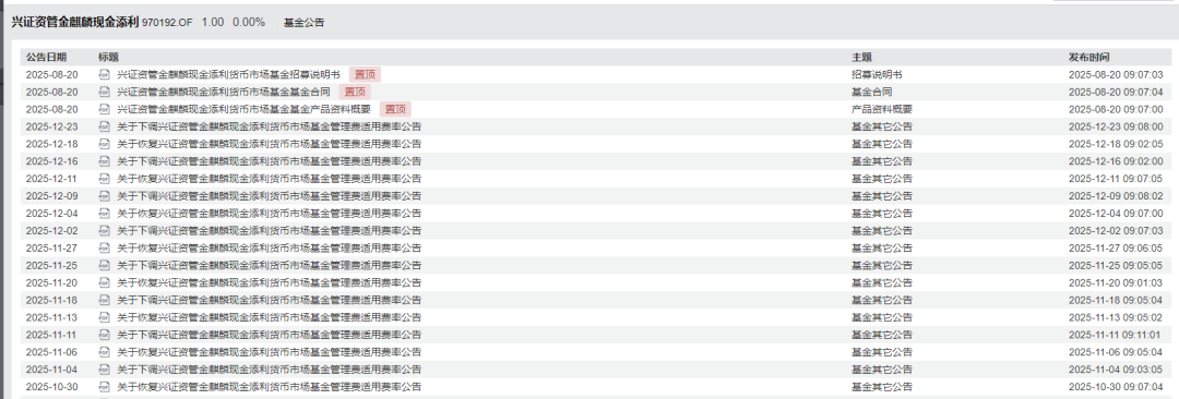因发生上述情况,兴证资管金麒麟现金添利于12月21日将管理费调整为0.3%,而在12月16日,该产品刚公告称风险消除之后恢复计提0.7%的管理费。梳理历史公告可见,类似的费率调整在近一个月内已多次上演。