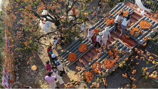 在平乐县柿子产业种植基地,游人正体验亲自采摘柿子的乐趣。