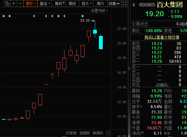 12月29日早盘,多只热门股开盘后股价跳水。百大集团开盘下跌1.55%,开盘后2分钟股价跌至9%以上,上午收盘时股价跌停。该股于12月26日盘中创年内高点,12月以来最大涨幅一度达到140%以上。