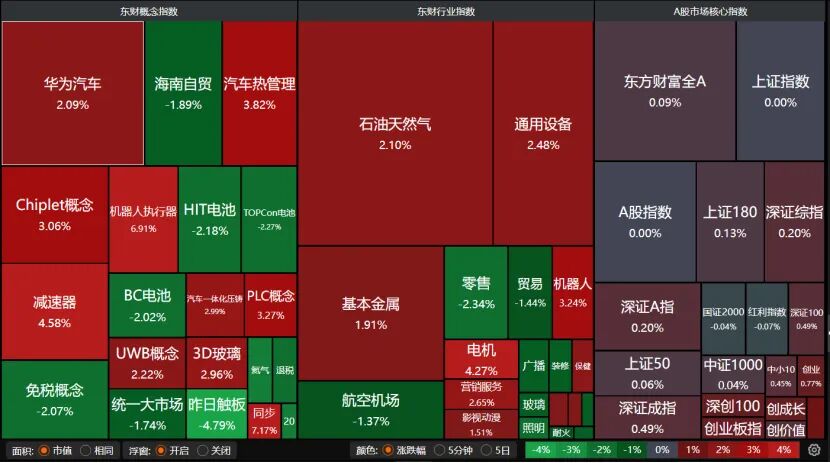 盘面上,石油天然气继续走强,基本金属反弹,通用设备、机器人、电机、减速器、华为汽车、汽车热管理领涨。但零售、海南自贸、航空机场、免税概念、HIT电池走弱。