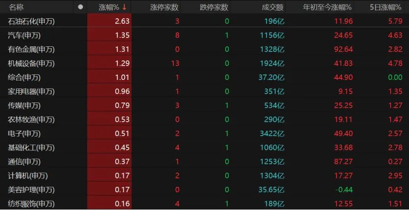 板块跌多涨少,轮动分化。31个申万一级行业中,14个收红。石油石化板块继续领涨,恒逸石化、统一股份、康普顿涨停。汽车、有色金属、机械设备等热门板块也表现不错。