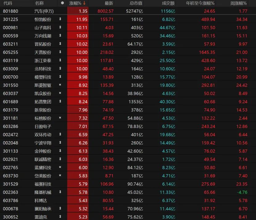 汽车股表现不错,28只相关个股涨幅超过5%,其中8只汽车股涨停,山子高科、万向钱潮、晋拓股份、天普股份均涨停。