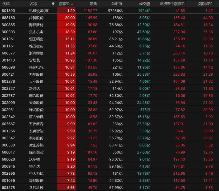 13只机械设备个股涨停,步科股份、海昌新材“20cm”涨停,大业股份、新时达、南兴股份、天奇股份、锋龙股份涨停。