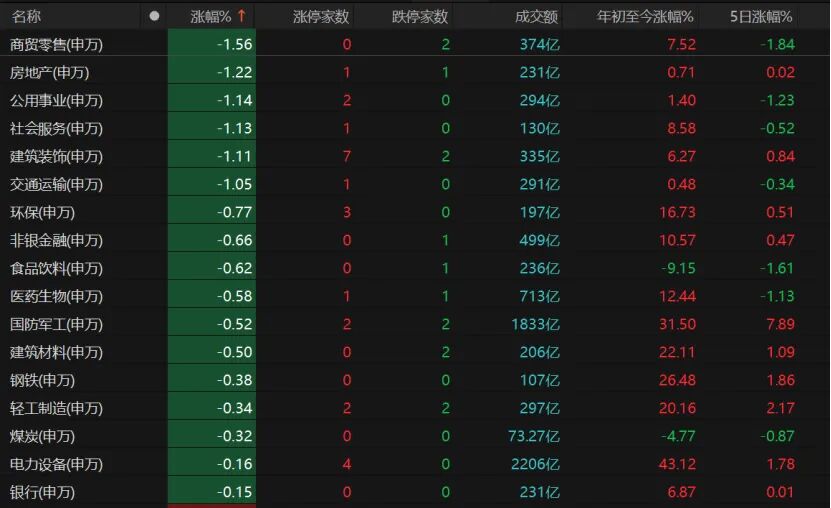资金分歧较大,商贸零售、房地产、公用事业、社会服务、建筑装饰、交通运输板块跌幅均超过1%。