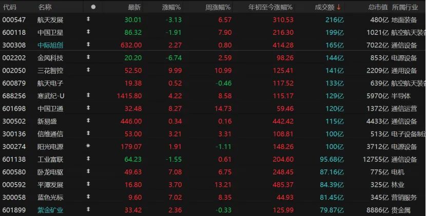 指数收红居多,但是个股跌多。3481只个股收跌,跌停股19只;1840只个股收涨,涨停股66只。11只个股日成交额不低于100亿元,航天发展回调逾3%,中国卫星也有所回落。中际旭创收涨2.27%报632元/股,三花智控涨停收报52.5元/股。寒武纪-U收涨4.22%报1415.8元/股,中国卫通涨逾8%。
