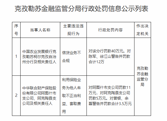 克孜勒苏金融监管分局决定:对阿图什市支公司罚款11万元,对阿克陶县支公司罚款5万元。对曾银、余磊警告并罚款合计3.5万元。
