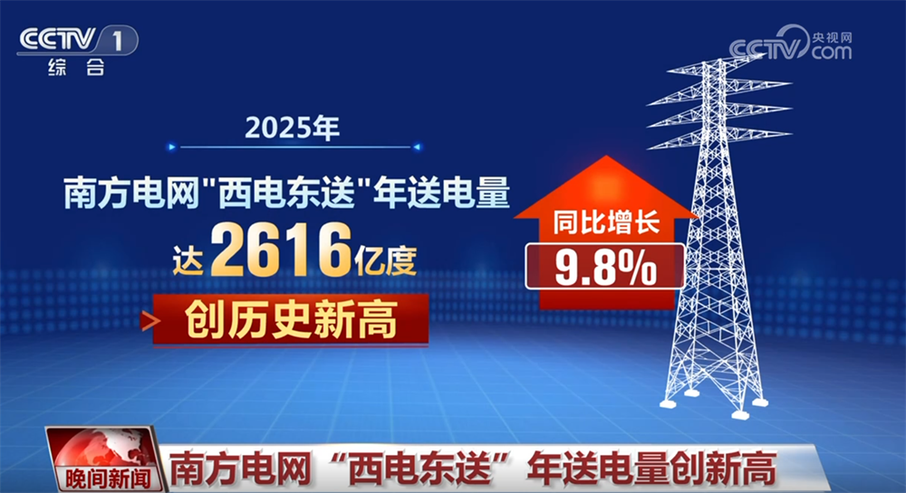 1月4日从南方电网了解到,2025年,南方电网西电东送年送电量达2616亿度,同比增长9.8%,创历史新高。在粤港澳大湾区,数字经济、先进制造等产业蓬勃发展,用电需求刚性增长,带动广东成为全国首个用电负荷突破1.6亿千瓦的省份。