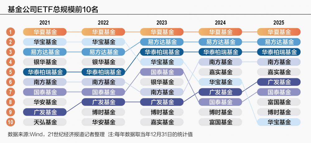 在ETF领域,行业头部集中的趋势十分明显。过去五年间,共有7家基金公司始终稳居ETF管理规模前十,构成了相对稳定的“核心圈”,包括华夏基金、易方达基金、华泰柏瑞基金、南方基金、广发基金、国泰基金和华宝基金。