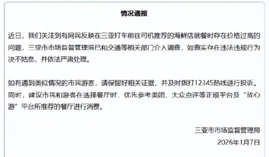 三亚市市场监督管理局1月7日发布:近日,我们关注到有网民反映在三亚打车前往司机推荐的海鲜店就餐时存在价格过高的问题,三亚市市场监督管理局已和交通等相关部门介入调查,如查实存在违法违规行为决不姑息,并依法严肃处理。